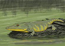 The marked reduction of the limbs and grooves on the head called sensory sulci show that Mastodonsaurus was an aquatic animal that rarely left water. Mastodonsaurus may have been completely unable to leave the water, as large quantities of bones have been found that suggest individuals died en masse when pools dried up during times of drought.[2] It inhabited swampy pools and lived mainly on fish, whose remains have been found in its fossilized coprolites.[2] It probably also ate land-living animals, such as small archosaurs. The fossils of some smaller temnospondyls bear tooth marks made by Mastodonsaurus-like animals.