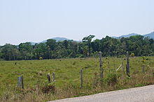 Much of the destruction of the rainforest has occurred through slash and burn farming, which allows for little to no fallow time and creates soil erosion.[28] It also depletes what little nutrition there is in the soil, which is then also polluted by the use of fertilizers and pesticides.[6] As of the first decade of the 21st century, it is estimated about two thirds of the Lacandon outside the main biosphere reserve has been converted into pasture or cropland.[1][31] Once this land has been cleared and used, it is very difficult to revert it to rainforest, even after it has been abandoned. Grass for pasture is particularly problematic because after it takes hold, does not allow natural vegetation to compete with it. In addition, the soil becomes compacted by the trampling of livestock. This degradation causes streams to dry up as evaporation rates rise from the lack of shade.[6][1]