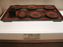 Various prehistoric lacquerwares have been unearthed in China dating back to the Neolithic period and objects with lacquer coating found in Japan dating to the late Jōmon period.[1] The earliest known lacquer object was thought to be a red wooden bowl, which was unearthed at a Hemudu culture (c. 5th millennium BC) site in Zhejiang, China.[2][3][4] However, older lacquerware, burial ornaments which were created in 7th millennium century B.C., were unearthed at the Kakinoshima Site in Hakodate, Hokkaido, Japan.[5]