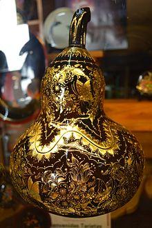Known in Mexican Spanish as laca or maque (from Japanese maki-e[43]), Mexican lacquer has independent origins from Asian lacquer. In the pre-Hispanic period, a substance from the larvae of aje scale insects and/or oil from the chia seed were mixed with powdered minerals to create protective coatings and decorative designs. During this period, the process was almost always applied to dried gourds, especially to make the cups that Mesoamerican nobility drank chocolate from.