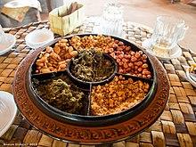 The most distinctive vessel is probably a rice bowl on a stem with a spired lid for monks called hsun ok. Lahpet ok is a shallow dish with a lid and has a number of compartments for serving lahpet (pickled tea) with its various accompaniments. Stackable tiffin carriers fastened with a single handle or hsun gyaink are usually plain red or black. Daunglan are low tables for meals and may be simple broad based or have three curved feet in animal or floral designs with a lid. Water carafes or yeidagaung with a cup doubling as a lid, and vases are also among lacquerware still in use in many monasteries.[38][39]