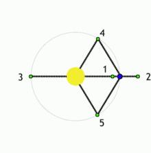 There are five such points, labeled L1 to L5, all in the orbital plane of the two large bodies, for each given combination of two orbital bodies. For instance, there are five Lagrangian points L1 to L5 for the Sun–Earth system, and in a similar way there are five different Lagrangian points for the Earth–Moon system. L1, L2, and L3 are on the line through the centers of the two large bodies, while L4 and L5 each act as the third vertex of an equilateral triangle formed with the centers of the two large bodies. L4 and L5 are stable, which implies that objects can orbit around them in a rotating coordinate system tied to the two large bodies.