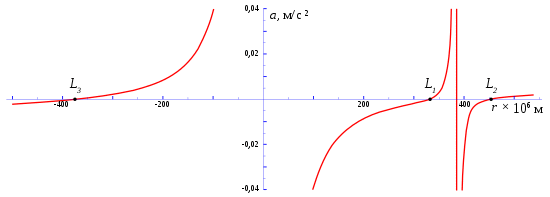 where r is the distance from the large body M1 and sgn(x) is the sign function of x. The terms in this function represent respectively: force from M1; force from M2; and centrifugal force. The points L3, L1, L2 occur where the acceleration is zero — see chart at right.
