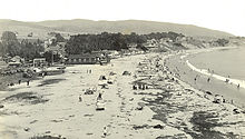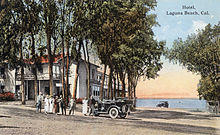 The community in Laguna Canyon and around the main beach expanded during the 1880s. The city officially founded a post office in 1887 under the name Lagona, but the postmaster in 1904, Nicholas Isch, successfully petitioned for a name correction to Laguna Beach.[26] By then Laguna Beach already had developed into a tourist destination.[27] Hubbard Goff built a large hotel at Arch Beach in 1886, which later was moved and added to Joseph Yoch's Laguna Beach Hotel built in 1888 on the main beach.[28] Visitors from local cities pitched tents on the beaches for vacation during the warm summers.[29]