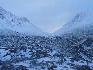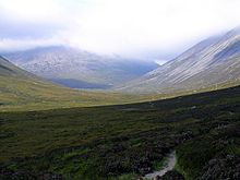 Although all the rain that falls on the slopes at either side of the southern half of the Lairig Ghru eventually drains into the River Dee and the "official" source of the River Dee, the Wells of Dee, is high on Braeriach, the River Dee (as a named watercourse on maps) starts at the confluence of Allt a' Gharbh choirie and Allt na Lairig Ghru. At this point, near the head of Glen Dee, the main valley turns roughly west towards An Garbh Choire, and the Lairig Ghru track continues northward into the hanging valley as shown in the photograph.