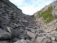 This boulder-strewn ravine is used as a route between the Lairig Ghru and Glen More. The name "Chalamain Gap" has been applied relatively recently to this ravine, since in Alexander (1928) the author does not name the gap, but describes it - writing: