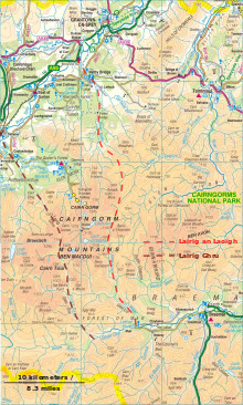 Like many traditional routes, the ends of the route through the Lairig Ghru are like the ends of a frayed rope. From the south the Lairig Ghru can be approached from Braemar though Glen Lui, or Glen Dee, and from Blair Atholl through Glen Tilt. From the north the Lairig Ghru can be approached from Glen More through the Chalamain Gap, and from Aviemore through the Rothiemurchus Forest by way of the Crossroads above Allt Drùidh.