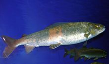 The most important local species for fisheries is the omul (Coregonus migratorius), an endemic whitefish.[25] It is caught, smoked, and then sold widely in markets around the lake. Also, a second endemic whitefish inhabits the lake, C. baicalensis.[47] The Baikal black grayling (Thymallus baicalensis), Baikal white grayling (T. brevipinnis), and Baikal sturgeon (Acipenser baerii baicalensis) are other important species with commercial value. They are also endemic to the Lake Baikal basin.[41][42][48][49]