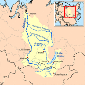 Russian expansion into the Buryat area around Lake Baikal[75] in 1628–58 was part of the Russian conquest of Siberia. It was done first by following the Angara River upstream from Yeniseysk (founded 1619) and later by moving south from the Lena River. Russians first heard of the Buryats in 1609 at Tomsk. According to folktales related a century after the fact, in 1623, Demid Pyanda, who may have been the first Russian to reach the Lena, crossed from the upper Lena to the Angara and arrived at Yeniseysk.[76]