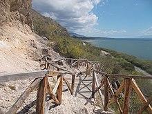 Lake Enriquillo is located within a linear depression that formed as a ramp basin between the Haiti fold and thrust belt to the north and the uplifted oceanic crust of the Massif de la Selle-Sierra de Bahoruco to the south.[9] The Enriquillo-Plantain Garden fault is a later strike-slip fault, cutting across the depression, which extends from Jamaica in the west, to near Neiba in the Dominican Republic in the east.[b] The valley, a former marine strait, was created around one million years ago when the water level fell and the strait was filled in by sediments of the Yaque del Sur River.[10] Tremors in the region are common.