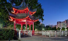 Lake Eola Park is a public park located in Downtown Orlando, Florida. Lake Eola is the main feature of the park. Also located in the park (on the west side) is the Walt Disney Amphitheater, which hosts many community events and various performances year round. On the east side of the park is a Chinese pagoda, and a playground. The park is surrounded by four streets: East Robinson Street (State Road 526), Rosalind Avenue (SR 527), East Central Boulevard, and North Eola Drive.