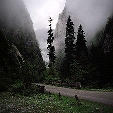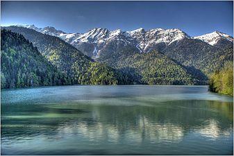 Lake Ritsa (Abkhazian: Риҵа, Georgian: რიწა, romanized: rits'a) is a lake in the Caucasus Mountains, in the north-western part of Abkhazia, Georgia, surrounded by mixed mountain forests and subalpine meadows. The road from the Black Sea coast was built in 1936. The resort of Avadhara lies to the north of the lake. The lake was an important tourist attraction during the Soviet period. It is still frequented by Russian tourists.