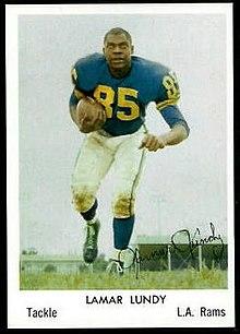 Lundy was born in Richmond, Indiana, and graduated from Richmond High School; a 2 sport star, Lamar led the Red Devils to the State Finals in basketball, playing for Hall of Fame Coach, Art Beckner. He was selected to the Indiana All-Star team; he was also an All-State player in football. When it came time to choose a college, Lamar selected and attended Purdue University, where he was the first black student to receive a football scholarship, and where he was named MVP of both the football and basketball teams in his senior year. He led the football team in receiving his senior season and was a 2x All-Big Ten (2nd Team) end. As a collegiate basketball player, Lamar scored 678 points (#73 all-time for the Boilermakers) and collected 533 rebounds (#29 all-time for the Boilermakers). He was a 3rd team All-Big Ten Center in 1957. The 6'7" Lundy was drafted by both the NFL and the NBA, but he opted for a career in football. Early in his professional career, Lundy (#85) was occasionally used as an offensive receiver, catching 35 passes for 584 yards and 6 touchdowns. He scored an additional 3 touchdowns on interception returns (coincidentally, on the only 3 interceptions of his NFL career). When he retired as a player, Lundy became an assistant coach for the San Diego Chargers, but was forced by illness to cease coaching.