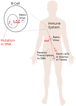 The mechanism was meant to explain why homologous DNA sequences from the VDJ gene regions of parent mice were found in their germ cells and seemed to persist in the offspring for a few generations. The mechanism involved the somatic selection and clonal amplification of newly acquired antibody gene sequences generated via somatic hypermutation in B-cells. The messenger RNA products of these somatically novel genes were captured by retroviruses endogenous to the B-cells and were then transported through the bloodstream where they could breach the Weismann or soma-germ barrier and reverse transcribe the newly acquired genes into the cells of the germ line, in the manner of Darwin's pangenes.[103][102][141]