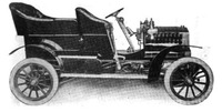Lambert Model A runabout with the chassis side shown. The motor can be seen placed in the rear with the engine cover raised. This is the lowest cost of the Lambert automobiles. This is done by placing the motor with a pair of opposed cylinders in the rear. It is also the most accessible motor location and also places the most weight on the drivers of the wheels. It is therefore an extremely suitable frame for a light low-priced automobile. This was the smallest, lightest and lowest priced 1906 model.[7]