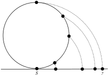To make this more precise, there is a unique circle centered at S, passing through P, and perpendicular to the plane. It intersects the plane in two points; let P′ be the one that is closer to P. This is the projected point. See the figure. The antipode of S is excluded from the projection because the required circle is not unique. The case of S is degenerate; S is projected to itself, along a circle of radius 0.[6]