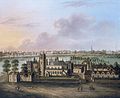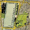 Map of 1897, showing Lambeth Palace across the River Thames from the Houses of Parliament, with Lambeth Bridge and Westminster Bridge over the river.