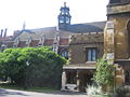 The oldest remaining part of the palace is the Early English chapel. Lollards' Tower, which retains evidence of its use as a prison in the 17th century, dates from 1435 to 1440. The front is an early Tudor brick gatehouse built by Cardinal John Morton and completed in 1495. Cardinal Pole lay in state in the palace for 40 days after he died there in 1558. The fig tree in the palace courtyard is possibly grown from a slip taken from one of the White Marseille fig trees here for centuries (reputedly planted by Cardinal Pole). In 1786,[3] there were three ancient figs, two "nailed against the wall" and still noted in 1826 as "two uncommonly fine... traditionally reported to have been planted by Cardinal Pole, and fixed against that part of the palace believed to have been founded by him. They are of the white Marseilles sort, and still bear delicious fruit. ...On the south side of the building, in a small private garden, is another tree of the same kind and age."[4] By 1882, their place had been taken by several massive offshoots.[5] The notable orchard of the medieval period has somewhat given way to a mirroring public park adjoining and built-up roads of housing and offices. The palace gardens were listed grade II in October 1987.[6]