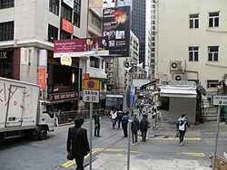 Lan Kwai Fong (often abbreviated as LKF) is a small square of streets in Central, Hong Kong. The area was dedicated to hawkers before the Second World War, but underwent a renaissance in the mid-1980s. It is now a popular expatriate haunt in Hong Kong for drinking, clubbing and dining. The street Lan Kwai Fong is L-shaped with two ends joining with D'Aguilar Street.[1]