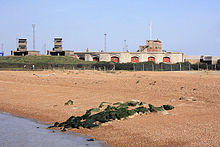 --HQ for the coast artillery guns defending Harwich Harbour. In 1944 radar was installed for their fire control. By 1941 4 6-inch and 2 twin-6-pdr guns were operational on the Landguard Peninsula, housed in concrete emplacements which remain;