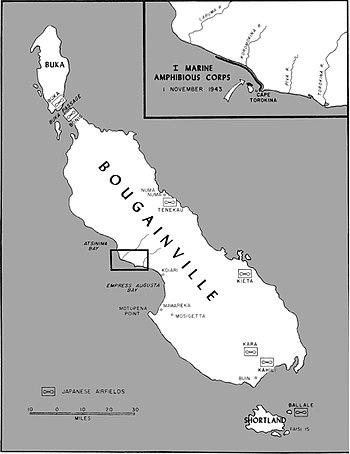 Intelligence gathered by Coastwatchers and landing parties had determined that there were few suitable landing beaches. The only viable options were located in Empress Augusta Bay, around Cape Torokina on the western coast of Bougainville. However, the area around Cape Torokina was less than ideal for airfield construction, as it was largely swamp and it would require significant development to make construction viable.[11] The bay was also open to the sea and was considered a "poor anchorage".[12] It would be exposed during the coming monsoon.[13] The location though, did have the advantage of isolation from the main Japanese concentrations around Buka and Buin in the north and south of the island, which would help Allied troops avoid a protracted battle while still enabling the neutralization of the Japanese airfields.[14] US planning staff predicted that it would take the Japanese three months to launch a counterattack on Torokina due to the terrain and the distance from their main troop concentrations. If they did, the Torokina area formed an excellent defensive position that could be held by the forces available. It was bordered by natural obstacles: the Laruna and Torokina Rivers, and the mountains.[15]