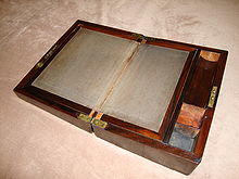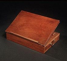 As an antique the lap desk is a smaller variant of the writing slope. It is also called a writing box or a writing cabinet. In certain instances it is known as a portable desk, a term which is usually applied to larger forms. Most antique lap desks are meant to be used on a table or some other stable surface. They are often strongly built of fine hardwoods like mahogany or walnut.