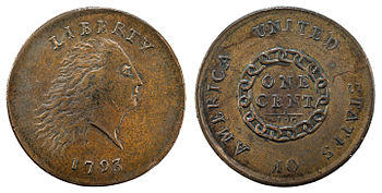 The United States large cent was a coin with a face value of 1/100 of a United States dollar. Its nominal diameter was 11&fras1;8 inch (28.57 mm). The first official mintage of the large cent was in 1793, and its production continued until 1857, when it was officially replaced by the modern-size one-cent coin (commonly called the penny).