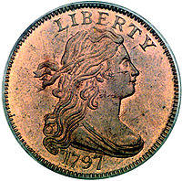 Robert Scot redesigned the whole of United States coinage for 1796, applying a new design featuring a bust of Liberty wearing a drapery at the neckline and a ribbon in her flowing hair. The reverse design now featured an olive wreath. As with earlier types, several minor revisions to the design were made in the first few years, with the final 1797 design lasting through the end of the type in 1807.