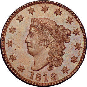 As a response to public criticism of the Classic Head, the Mint assigned Chief Engraver Scot to redesign the cent in 1816. This newest design enlarged the obverse portrait, giving Liberty a much more mature look (leading to the Matron Head reference), and surrounded the portrait with stars along the outer edge of the coin. The "Matron head" design was modified in 1835 to give Liberty a younger look and matron head cents continued to be made until 1839.