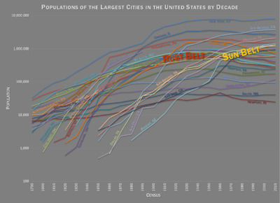 Seven of the country's ten largest cities in 2010 were located in the Sun Belt region of the south and west, all of which have far lower population density than their earlier top-ranking counterparts. A different ranking is evident when considering U.S. metro area populations which count both city and suburban populations.