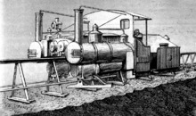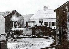 The three locomotives were of the 0-3-0 type, constructed by the Hunslet Engine Company.[5] They were specially built with two boilers to balance on the track, and consequently two fireboxes, one of which had to be stoked by the driver. They were also fitted with powered tenders for auxiliary use on hills. The tender wheels were driven by two cylinders via spur gears. Two small chimneys were fitted to each tender to discharge the exhaust steam from these cylinders. A smaller engine, nicknamed the "coffee pot", was used in the construction of the railway, having been used previously on a demonstration line at Tothill Fields in London. It can be seen on an early photo of 1888.