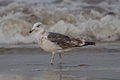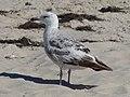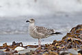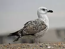 Juvenile birds of under a year old have scaly, checkered black-brown upper parts, the head and underparts streaked with gray brown, and a neat wing pattern. The face and nape are paler and the wing flight feathers are blackish-brown. The juvenile's tail is white with zigzag bars and spots at base and a broken blackish band near the tip. The bill of the juvenile is brownish-black with white tip and the legs dark bluish-gray with some pink tones. As the young gull ages, the gray-brown coloration gradually fades to more contrasting plumage and the bill darkens to black before growing paler. By the third year, the young gulls resemble a streakier, dirtier-looking version of the adult. They take at least four years to reach maturity, development in this species being somewhat slower than that of other large gulls. The call is a deep "laughing" cry, kaa-ga-ga, with the first note sometimes drawn out in an almost bovid-like sound. The voice is distinctly deeper than most other gull species.[18][19]