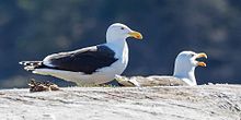 This is a relatively long-living bird. The maximum recorded age for a wild great black-backed gull is 27.1 years.[40] This species is rarely kept in captivity, but domestically kept European herring gulls have been known to live for over 44 years and generally larger birds can outlive smaller ones.[41] Mortality typically occurs in the early stages of life, when harsh weather conditions (including flooding) and starvation can threaten them, as well as predators. Chicks and eggs are preyed on by crows (Corvus ssp.), cats (Felis catus), other gulls, raccoons (Procyon lotor) and rats (Rattus ssp.). The bald eagle (Haliaeetus leucocephalus),[42] white-tailed eagle (H. albicilla) and golden eagle (Aquila chrysaetos) are the only birds known to habitually predate healthy, fully grown great black-backed gulls.[43] In one study from Norway, great black-backed gulls were the fifth highest frequency prey item for white-tailed eagles and gulls are prone to mobbing these huge eagles.[44][45] A great skua (Stercorarius skua) was filmed in Scotland unsuccessfully attempting to kill a second or third year great black-backed gull.[46] In Norway, great black-backed gulls have also been reported to fall prey to Eurasian eagle-owls (Bubo bubo).[47] Killer whales (Orcinus orca) and sharks also reportedly prey upon adult and juvenile birds at sea. In some biomes, where large eagles are absent the great black-backed gull may be considered the apex predator.[19]