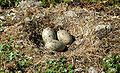 They make a lined nest on the ground often on top of a rocky stack, fallen log or other obstructing object which can protect the eggs from the elements. Usually, several nest scrapes are made before the one deemed best by the parents is selected and then lined with grass, seaweed or moss or objects such as rope or plastic. When nesting on roofs in urban environments, previous year's nests are often reused over and over again. The female lays usually three eggs sometime between late April and late June. When only two eggs are found in a nest, the reason is almost always that one egg, for one reason or another, has been destroyed. It takes around one week for the female to produce the three eggs, and the incubation doesn't begin until all three eggs are laid. Hence all three chicks are hatched the same day. The birds are usually successful in bringing up all the three chicks.
