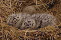 The eggs are greenish-brown with dark speckles and blotches. Both parents participate in the incubation stage, which lasts for approximately 28 days. During this time, the birds attempt to avoid being noticed and stay silent. The breeding pair are devoted parents who both take shifts brooding the young, defending the nest and gathering food. Young great black-backed gulls leave the nest area at 50 days of age and may remain with their parents for an overall period of around six months, though most fledglings choose to congregate with other immature gulls in the search for food by fall. These gulls reach breeding maturity when they obtain adult plumage at four years, though may not successfully breed until they are six years old.[18]