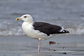 The adult great black-backed gull is fairly distinctive, as no other very large gull with blackish coloration on its upper-wings generally occurs in the North Atlantic. In other white-headed North Atlantic gulls, the mantle is generally a lighter gray color and, in some species, it is a light powdery color or even pinkish.[13] It is grayish-black on the wings and back, with conspicuous, contrasting white "mirrors" at the wing tips. The legs are pinkish, and the bill is yellow or yellow-pink with some orange or red near tip of lower bill. The adult lesser black-backed gull (L. fuscus) is distinctly smaller, typically weighing about half as much as a great black-back. The lesser black-back has yellowish legs and a mantle that can range from slate-gray to brownish-colored but it is never as dark as the larger species. A few superficially similar dark-backed, fairly large gulls occur in the Pacific Ocean or in the tropics, all generally far outside this species' range, such as the slaty-backed (L. schistisagus), the western (L. occidentalis) and the kelp gull (L. dominicanus).[9][13]