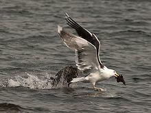 Unlike most other Larus gulls, they are highly predatory and frequently hunt and kill any prey smaller than themselves, behaving more like a raptor than a typical larid gull. Lacking the razor-sharp talons and curved, tearing beak of a raptor, the great black-backed gull relies on aggression, physical strength and endurance when hunting. When attacking other animals, they usually attack seabird eggs, nestlings or fledglings at the nest, perhaps most numerously terns,[31] but also including smaller gull species as well as eiders,[32] gannets and various alcids. In Newfoundland and Nova Scotia, 10% of the stomach contents of great black-backed gulls was made up of birds, while a further 17% of stomach contents was made up of tern eggs alone.[27][28] Adult or fledged juveniles of various bird species have also been predaceously attacked. Some fully-fledged or adult birds observed to be hunted in flight or on the ground by great black-backed gulls have included Anas ducks, ruddy ducks (Oxyura jamaicensis), buffleheads (Bucephala albeola), Manx shearwaters (Puffinus puffinus), pied-billed grebes (Podilymbus podiceps), common moorhens (Gallinula chloropus), terns, Atlantic puffins (Fratercula arctica), Dovekie (Alle alle), coots (Fulica ssp.), glossy ibises (Plegadis falcinellus), rock pigeons (Columba livia) and even predatory birds such as hen harriers (Circus cyaneus). When attacking other flying birds, the great black-backed gulls often pursue them on the wing and attack them by jabbing with their bill, hoping to bring down the other bird either by creating an open wound or simply via exhaustion. They may kill healthy adult birds weighing up to at least 750 g (1.65 lb) but take exclusively the small young of larger birds such as common eider (Somateria mollissima) and cormorants.[22][33][34][35][36][37][38] They will also catch flying passerines, which they typically target while the small birds are exhausted from migration and swallow them immediately.[22] Great black-backed gull also feed on land animals, including rats (Rattus ssp.) at garbage dumps and even sickly lambs (Ovis aries).[18][19]