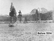 On May 30, 1914, despite an apparent lack of precursor earthquakes,[66] Lassen became volcanically active again after 27,000 years of dormancy, when it produced a steam explosion that carved out a small crater with a fairly deep lake[67] on the volcano's summit.[41] The crater grew as it was carved by more than 180 similar phreatic explosions over the span of more than 11 months, reaching a length of 1,000 ft (300 m). On May 14, 1915, Lassen Peak erupted lava blocks, which extended as far as Manton, 20 mi (32 km) west of the mountain. By the next day, the volcano had produced a dacitic lava dome, between 63 and 68 percent silica, which occupied its summit crater.[68] On May 19, a large eruption destroyed this dome, and a new crater formed at the summit. No lava erupted, but parts of the dome fell on the upper flanks of the mountain, which were covered in more than 30 ft (9.1 m) of snow. The lava mixed with snow and rock to form a lahar (volcanically induced mudslide, landslide, and debris flow), 0.5 mi (0.80 km) in width, which coursed down the side of the volcano, traveling 4 mi (6.4 km) and reaching Hat Creek. After being deflected to the northwest at Emigrant Pass, the lahar extended an additional 7 mi (11 km) down Lost Creek. On May 20, the lower Hat Creek valley flooded with muddy water, which damaged ranch houses in the Old Station area and caused minor injuries among a few people, all of whom escaped.[68] Removing homes from their foundation,[69] the lahar also uprooted trees more than 100 ft (30 m) tall. The flood continued for another 30 mi (48 km), killing fish in the Pit River. Simultaneously, dacite lava with lower viscosity than dacite from the previous eruption filled the summit crater, overflowing and extending in two streams for 1,000 ft (300 m) down the mountain's western and northeastern sides.[68]