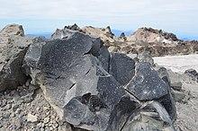 The only Cascade volcano with an elevation above 10,000 ft (3,000 m) that is not a stratovolcano,[7] Lassen Peak is a rhyodacitic lava dome.[42] It represents one of the largest lava domes on Earth, with a height of 2,000 ft (610 m) above its surroundings,[41] and an approximate volume of 0.60 cu mi (2.5 km3).[43] Unlike more conventional, conical stratovolcanoes like Mount Shasta or Mount Rainier, Lassen Peak is part of a volcanic center that erupts from different vents, which each remain active for a number of years or decades but often do not erupt from the same vent twice, also known as a monogenetic volcanic field.[44] 2000 years after Lassen's formation, it was surrounded by glaciers which ate away at its spiny protrusions of dacite.[45] Due to glacial erosion from the last local glacial advance, which ceased roughly 15,000 years ago, Lassen's lava dome is now covered in broken rock fragments at the base of crags called talus deposits. Only its crag formations on its southern flank, near the summit trailhead, have not been significantly altered by glacial erosion.[46]