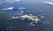 Lassen Peak reaches an elevation of 10,440 ft (3,180 m), according to 1992 data from the U.S. National Geodetic Survey;[1] 1981 data from the Geographic Names Information System lists the mountain's elevation at 10,457 ft (3,187 m).[6] Lassen Peak marks the southernmost major volcano in the Cascade Range, rising above the northern Sacramento Valley.[7] Bounded by the Sacramento Valley and the Klamath Mountains to the west and the Sierra Nevada mountain range to the south,[8] it is the second tallest peak in the California segment of the Cascades,[9] behind Mount Shasta, which lies 80 mi (130 km) to the north.[10] Due to its proximity to nearby volcanoes Mount Tehama and Mount Diller, it is not easy to distinguish from its neighboring peaks.[7]
