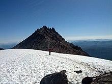 The mountain's summit trail can be accessed from a parking lot on the northern side of the California State Route 89.[38] The Lassen Peak Trail, which starts from this parking area, runs for 2.5 mi (4.0 km) with switchback turns,[38] a round-trip hike 5 mi (8.0 km) in length that ascends approximately 2,000 ft (610 m) from the trailhead at 8,500 ft (2,600 m) to the summit at 10,457 ft (3,187 m).[95] From the northeast summit, Lassen's 1915 mudflow and Prospect Peak are visible;[38] the northwestern summit offers views of Lassen's two bowl-shaped craters and Mount Shasta, 80 mi (130 km) to the north.[94]