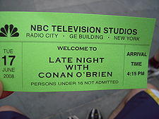 Late Night was a production of Lorne Michaels's Broadway Video (and, since 2003, O'Brien's Conaco). It was taped in Studio 6A in the GE Building at 30 Rockefeller Plaza in New York City. Next to the door were framed pictures of Letterman, Carson, Jack Paar and Steve Allen, each of whose groundbreaking late-night shows originated from studio 6A or 6B (where The Tonight Show Starring Jimmy Fallon is currently taped).[25] The studio holds just over 200 audience members. It was taped at about 5:30 pm as an uninterrupted hour-long program, with the band playing music through the portions that would be filled by commercials. Generally, shows were taped at 5:30 pm Monday through Friday, although for much of the show's run, reruns would be aired on Mondays and the show would not tape that day.