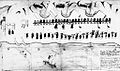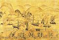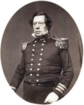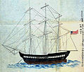 When Commodore Matthew C. Perry's four-ship squadron appeared in Edo Bay (Tokyo Bay) in July 1853, the shogunate was thrown into turmoil. Commodore Perry was fully prepared for hostilities if his negotiations with the Japanese failed, and threatened to open fire if the Japanese refused to negotiate. He gave them two white flags, telling them to hoist the flags when they wished a bombardment from his fleet to cease and to surrender.[8] To demonstrate his weapons, Perry ordered his ships to attack several buildings around the harbor. The ships of Perry were equipped with new Paixhans shell guns, capable of bringing destruction everywhere a shell landed.[9][10]
