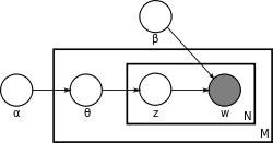 The fact that W is grayed out means that words are the only observable variables, and the other variables are latent variables. As proposed in the original paper,[3] a sparse Dirichlet prior can be used to model the topic-word distribution, following the intuition that the probability distribution over words in a topic is skewed, so that only a small set of words have high probability. The resulting model is the most widely applied variant of LDA today. The plate notation for this model is shown on the right, where denotes the number of topics and are -dimensional vectors storing the parameters of the Dirichlet-distributed topic-word distributions ( is the number of words in the vocabulary).