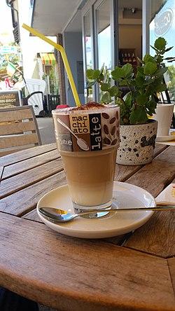 Latte macchiato (Italian pronunciation: [ˈlatte makˈkjaːto]) is a coffee beverage; the name means stained or marked milk. Marked as in an espresso stain on the milk used. It is a play on “Espresso macchiato” which is an espresso with a drop or two of milk or cream.