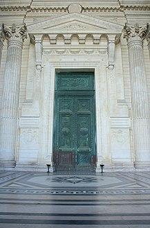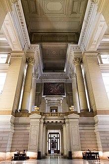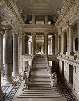 The building includes huge interior statues of Demosthenes and Lycurgus by the sculptor Pierre Armand Cattier, and figures of the Roman jurists Cicero and Ulpian by Antoine-Félix Bouré. The central portico, 39 metres (128 ft) high, is surmounted by a bust of the ancient Greek Titaness Themis, personification of divine law and order, by Joseph Ducaju. Moreover, the impressive main hall or salle des pas perdus (literally meaning "room of the lost steps") is around 3,600 m2 (39,000 sq ft) including the first floor gallery; 90 metres (300 ft) long and 40 metres (130 ft) wide. A compass rose with sixteen rays indicates the centre of the room.