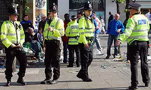 Police officers are granted certain powers to enable them to execute their duties. Their primary duties are the protection of life and property, preservation of the peace, and prevention and detection of criminal offences.[1] In the British model of policing, officers exercise their powers to police with the implicit consent of the public. "Policing by consent" is the phrase used to describe this. It expresses that the legitimacy of policing in the eyes of the public is based upon a general consensus of support that follows from transparency about their powers, their integrity in exercising those powers and their accountability for doing so.[2][3]