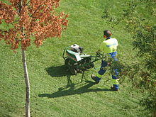 A lawn aerator is a garden tool designed to create holes in the soil in order to help lawn grasses grow.[1] In compacted lawns, aeration improves soil drainage and encourages worms, microfauna and microflora which require oxygen.[2]
