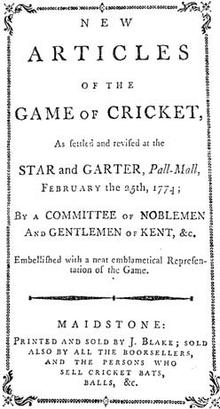 - ^ a b c Leach, John (2007). "From Lads to Lord's (1774) – The Laws of Cricket 1774". Stumpsite. Archived from the original on 29 June 2011. Retrieved 29 June 2017.