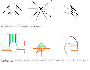 Blended Elevation: The top section (bob section) is cut at 90 degrees while the side sections are cut 180 deg to the length of the top section. The occipital and nape sections are cut at 90 deg. In this form of layering there is an "elevated" group of layers formed due to shorter top section and then it blends with the softer side and back layers. Not suitable for wavy or curly hair, but for straight or slightly wavy hair.